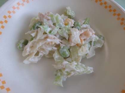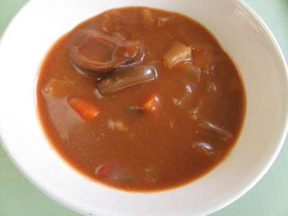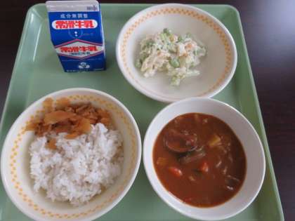 献立は、夏野菜カレー、チキンサラダ、ふくじん漬け、麦ご飯、牛乳です。カレーには、ナスが入っていました。