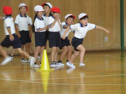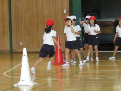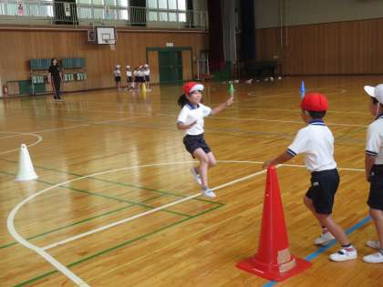 カラーコーンをジグザグに走りながら、折り返しリレーをしました。勝負がかかると、みんな必死になりますね。