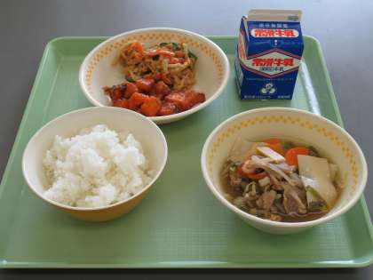 今日のメニューは、ワンタンスープ、ホキのチリソースかけ、切り干し大根の中華あえ、ごはん、牛乳です。