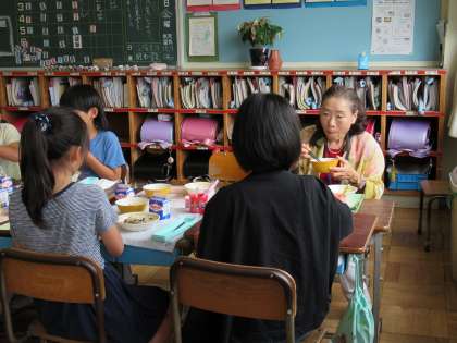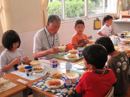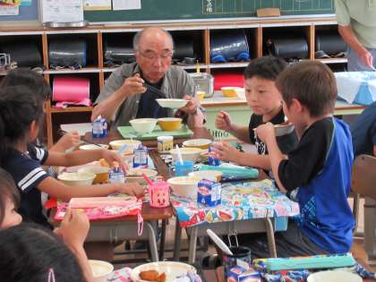 今日は、見守り隊のみなさんと一緒に給食を食べました。いつもお世話になり、ありがとうございます。まずは、1〜3年生の様子です。