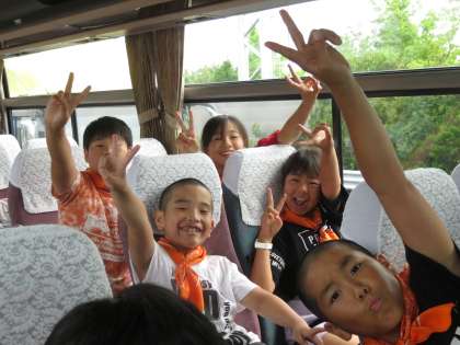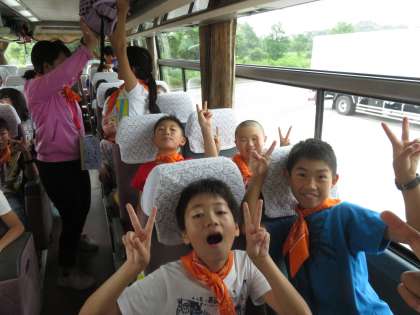 5年生が楽しみにしていた林間学校の始まりです。バスの中は笑顔でいっぱいです。