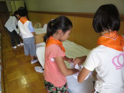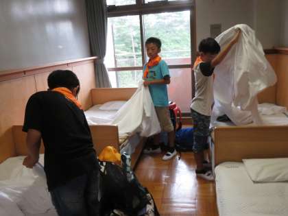シーツが配付され、各部屋でベッドメーキングをしました。まだ、14:00前ですが、寝る準備も万全です。