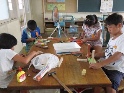 かなづちでくぎを打ちながら、作品づくりが進んでいます。