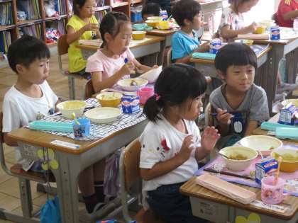 今日の給食は、カレーライス。みんな喜んで食べていました。