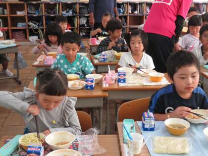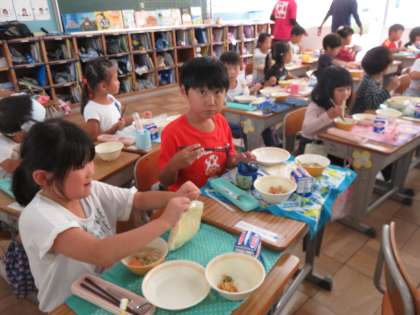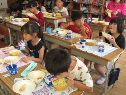 今日のメニュー、ちゃんぽんめん、とてもおいしいです。1年生も、もりもり食べていました。