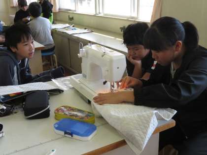 ミシンを使って、トートバッグづくりが進められています。指導者は、教頭先生、教務主任の先生、完璧です。