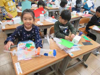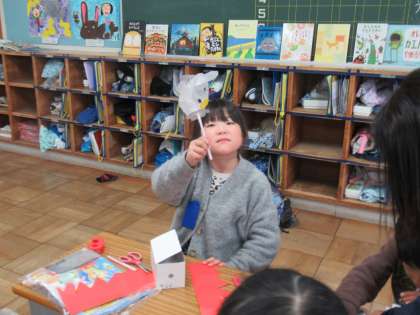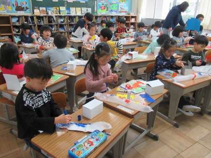 はこに絵を描いたり、色紙を貼ったりして飾り付けをしました。飛び出る袋に色をつけている子もいました。できあがりが楽しみですね。