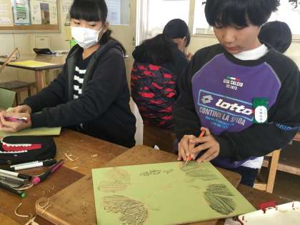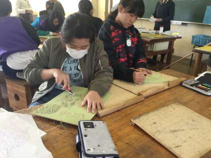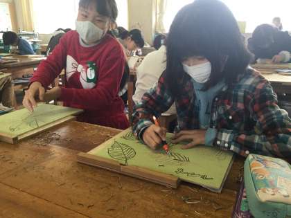 木の葉っぱを版画で彫っていました。