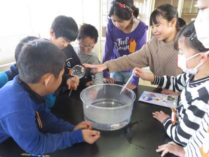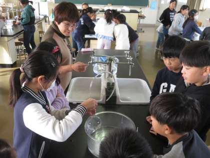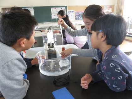 水を温めたり冷やしたりして、体積が変わるかどうかを調べます。安全に注意しながら、班ごとに実験をしていきます。