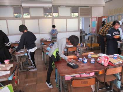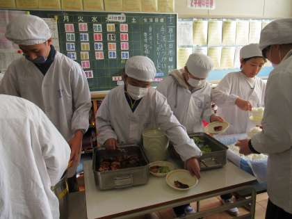 給食の準備中です。台ふきの係も給食当番もしっかり働いています。