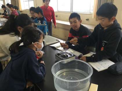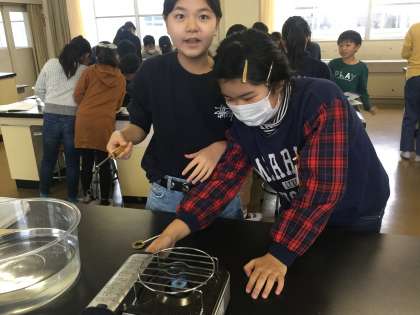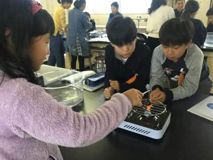 鉄の玉をガスコンロで温めると体積が増えることがわかりました。