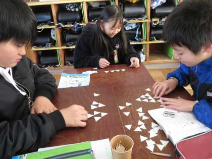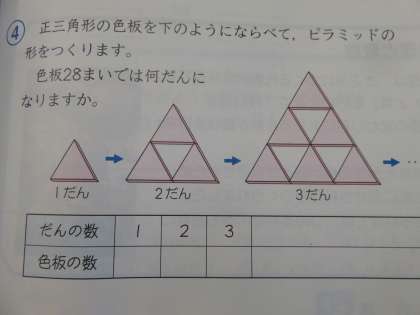教科書の問題(写真参照)を解くための法則を見つけます。まずは、三角形を実際に並べて答えを見つけます。その後、法則を見つけます。どんな法則が見つかったかな?