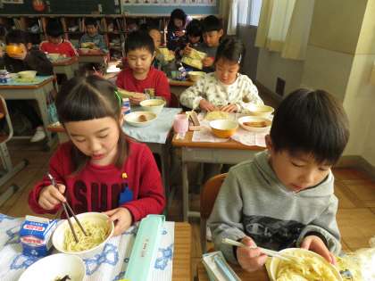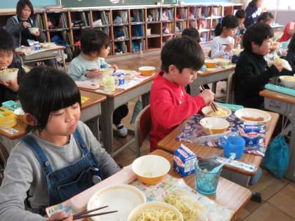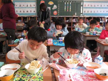 食器の中に中華めんを入れるために、半分または1/4に切ることが必要です。上手く切れず、先生に切ってもらう子もちらほらいました。