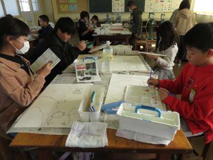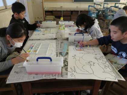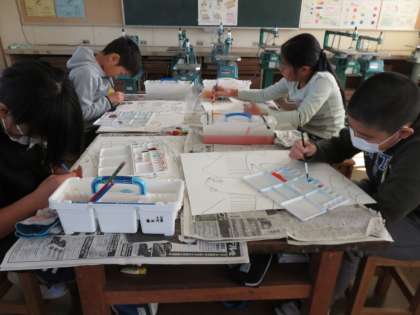 物語の一場面の下絵が描けました。今日は、色の三原色+白を使って、色をつくり、ぬっていきます。にじみ・吹き流し・スパッタリング等の技法を使い、色ぬりが進んでいきます。