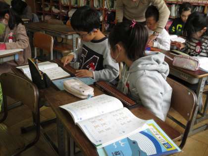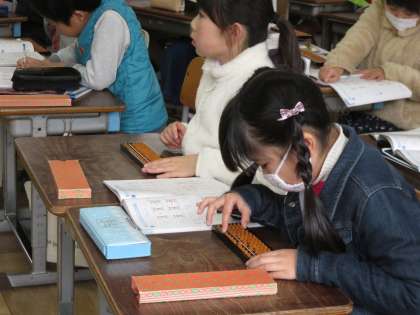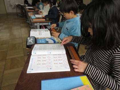 そろばんで、2けたのたし算の計算をしていました。指先を使うことは、大切ですね。