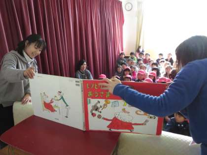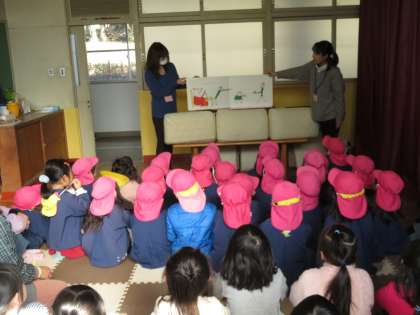 大放課に、たんぽぽのメンバーの方による読み聞かせがありました。今回は、南粕谷保育園の年長の子どもたちも一緒にお話を聞きました。