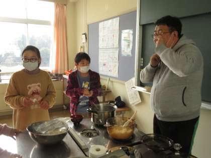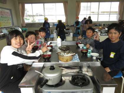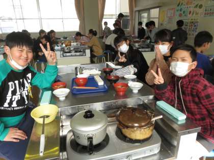 ご飯とみそ汁が出来上がりました。まずは、担任の先生に各班のご飯をひとくちずつ食べてもらいました。そして、待ちに待った会食です。