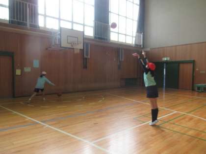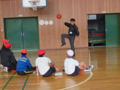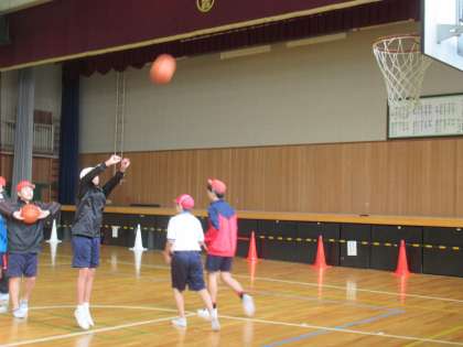 体育の時間に、バスケットボールのシュート練習をしました。今日のスペシャルコーチは舩津先生。レイアップシュートの仕方を教えてもらいました。