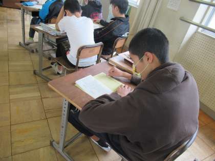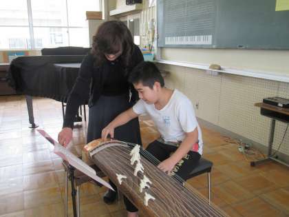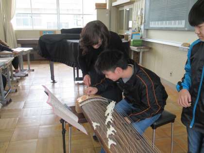 今日の音楽では、琴の演奏をしました。まず初めにプリントの上で指使いを練習し、その後一人ずつ演奏してみました。お琴の定番「さくら さくら」の素敵な音色が音楽室に響いていました。