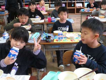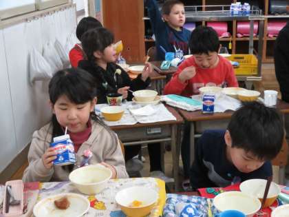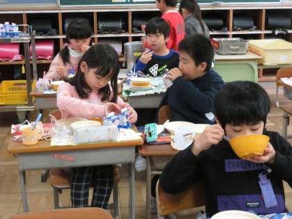 インフルエンザの予防のため、前を向いて給食を食べていました。
