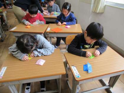 今度の入学説明会に向けて、メダルを作りました。折り紙を使って上手にできましたね。年長さんのみんなが来てくれるのが楽しみです!