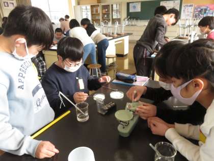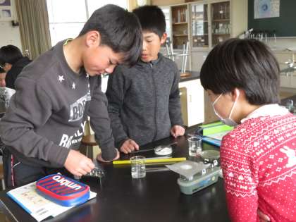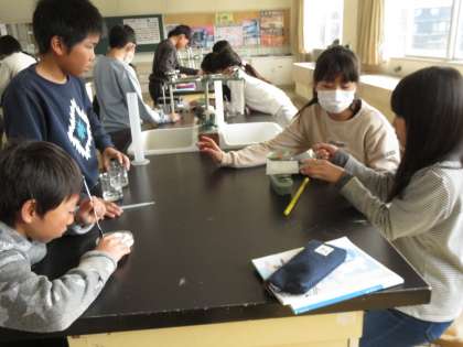 食塩、ミョウバン、砂糖がどれだけ水に溶けるかの実験をします。先生の説明をよく聞いて、実験を始めます。