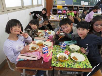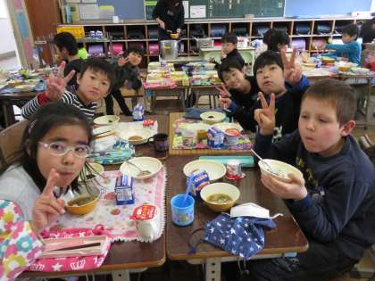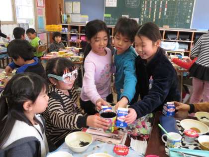 いただきます終了後、今日、誕生日の子の所にみんなが牛乳を持って、乾杯に来ました。ほほえましい光景です。