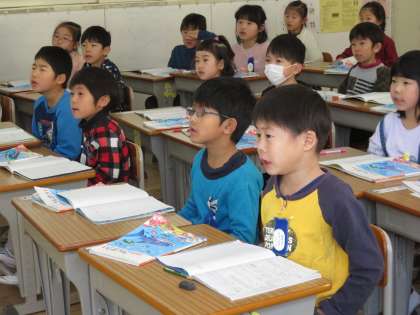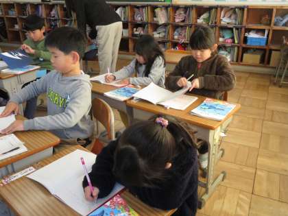 黒板に書かれた問題文を、みんなで読みました。その後、ノートに式と答えを書きました。みんな、よくできていました。