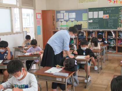 栄養教諭の先生に来ていただき、今日は2年生が食の指導を受けました。「形をかえてできる食べ物をしろう」というめあてで学習しました。私たちがよく食べている食品を、肉からできているもの、牛乳からできているもの、大豆からできているものなどに分類していきます。いろいろなものをバランスよく食べたいですね。