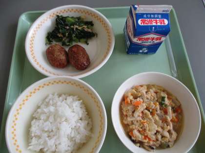 ・牛乳 ・ごはん ・レバー入り白ごまつくね2個 ・高野豆腐の卵とじ ・白菜と小松菜のおかかあえ