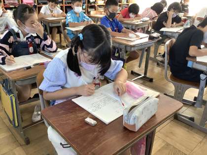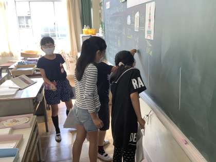 建物の高さが倍の関係にあることをヒントにして、高さを求める計算をしていました。