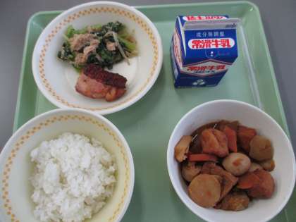 ・牛乳 ・ごはん ・鶏肉の生姜焼き ・みそおでん ・小松菜ともやしのごまあえ