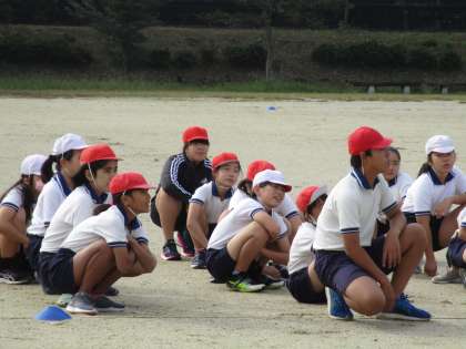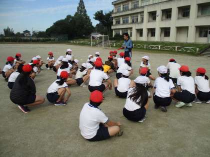 秋晴れの下、運動場でリレーの授業です。