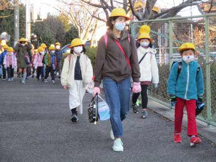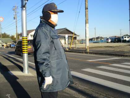 交通立哨の日で、交通指導員さんも立っていただいています。