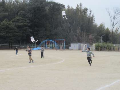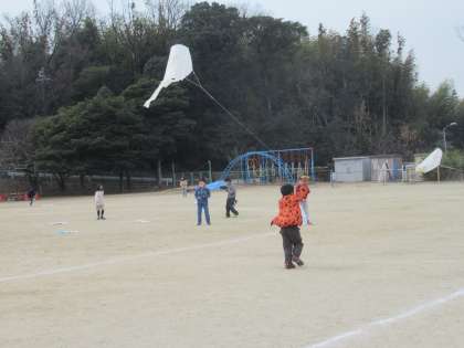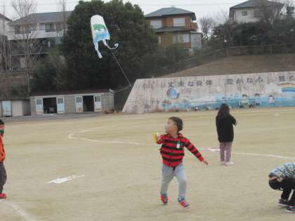 図工の時間に絵を描いて作ったたこを上げました。今日はあまり風がなく、運動場を走り回ってがんばって上げていました。高く上がるとうれしいですね。