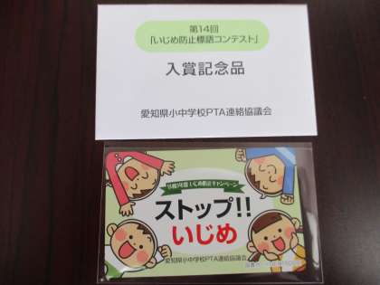 愛知県小中学校PTA連絡協議会から「いじめ防止標語コンテスト」の第1次審査通過者の連絡があり、記念品が贈呈されました。