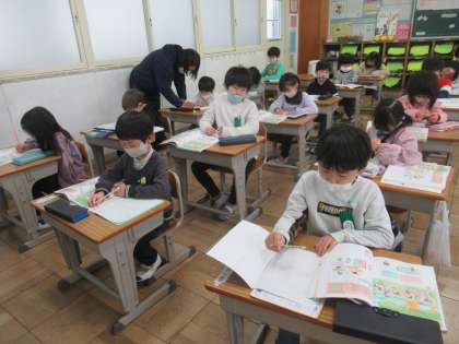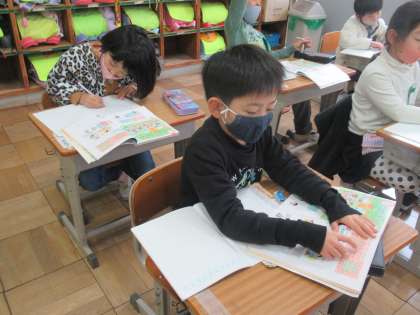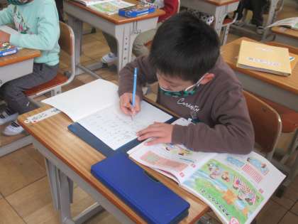 今日の算数では、広さの比べ方を考えます。始めに2枚の紙を重ねて、どちらが大きいかを比べました。次は、教科書の問題に挑戦です。どちらが大きいかを考えてノートに答えを書いていました。