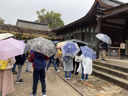 予定どおり、分散研修が春日大社から始まりました。 班で協力して研修をします。