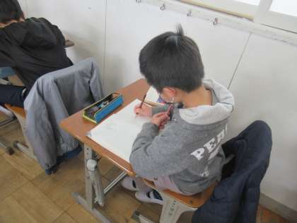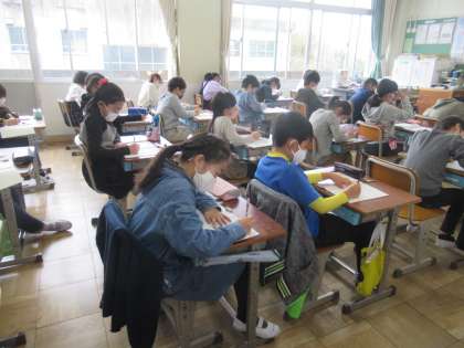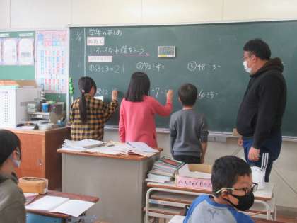 算数では、一年間で学習した内容を復習しています。今日は、わり算の問題を解きました。暗算、一けたで割る筆算、二けたで割る筆算、小数のわり算など、たくさんの問題にチャレンジしました。