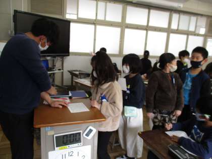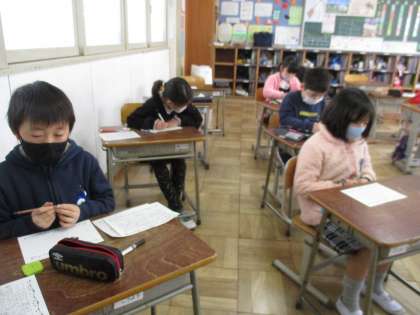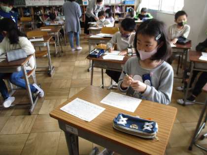 下書きを見ながら書く、先生に見せる、名前ペンで清書する、色紙をはるという手順で進めました。