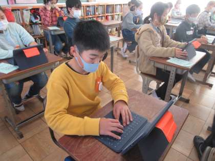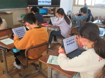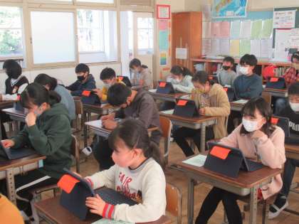 タブレットを使って、校外学習のまとめをします。写真を選んだり、文章を打ち込んだりしたものをみんなで共有します。タブレットの使い方にも慣れて、スムーズに作業ができました。