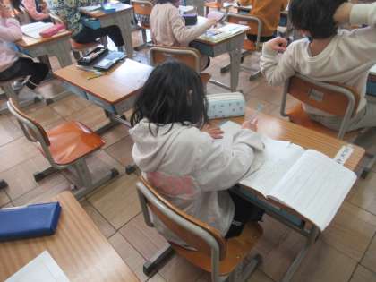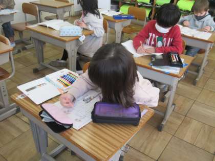 1年生でがんばったことや楽しかったことを、作文で表しました。始めに「知多の友」に下書きし、先生の点検を受けたら清書です。絵も添えて、上手に書けていました。