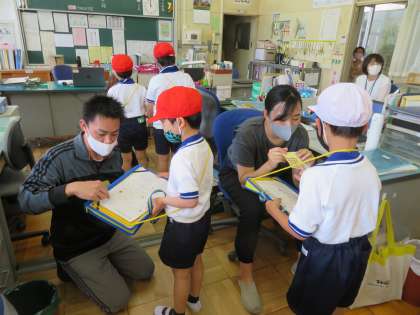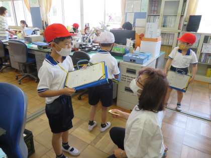 「こんにちは大作戦」を行いました。先生方に自分の名前を言ってシールをはってもらいました。