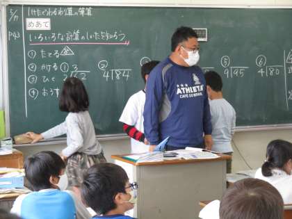 計算の仕方は、「たてる」「かける」「ひく」「おろす」という順番で計算していきます。