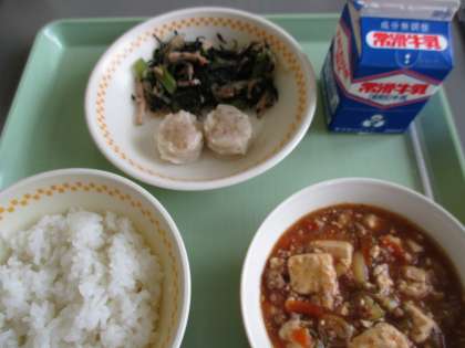 ・牛乳 ・ごはん ・えびしゅうまい2個 ・麻婆豆腐 ・春雨とひじきの中華サラダ