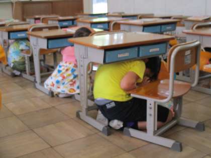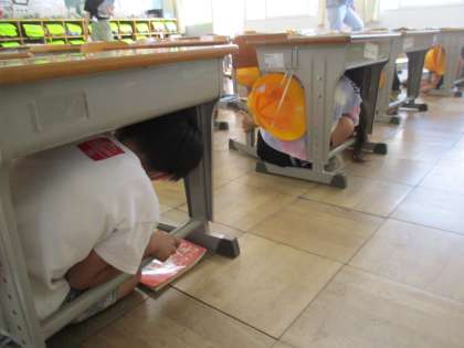 放送で地震の音を聞いて、机の下に入って体を守る行動をしました。