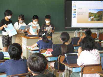 電子黒板に大きく写して発表すると、たくさんの人が見やすい効果があります。