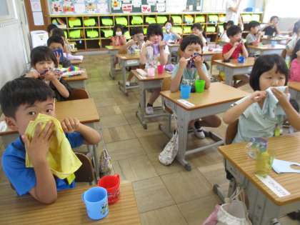 家でも学校でも歯みがきをして、自分の歯や口の中をきれいにしておきましょう。