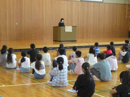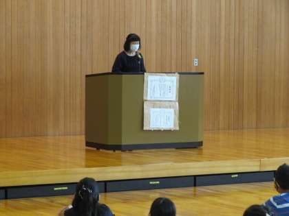体育館で久しぶりの朝会が行われました。校長先生から、コロナ感染や熱中症に引き続き気を付けて生活することなどの話がありくました。今日は「夏至」1年で一番日が長い日であることも教えていただきました。
