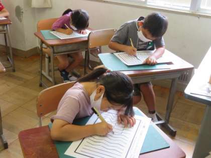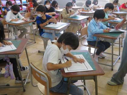 「カッターナイフで紙を切ろう」で、カッターナイフの使い方について真剣に聞き、けがをしないように気を付けて、練習用の紙を使い切ってみました。